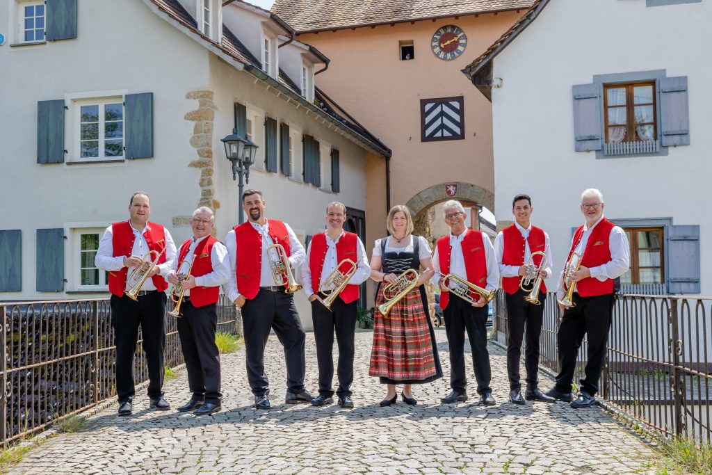 Michael Stihl (3.v.l.), Christoph Meyer (4.v.l.), Robin Götz (7.v.l.). Es fehlen Philipp Ritter und Pascal Beske (Flügelhorn)